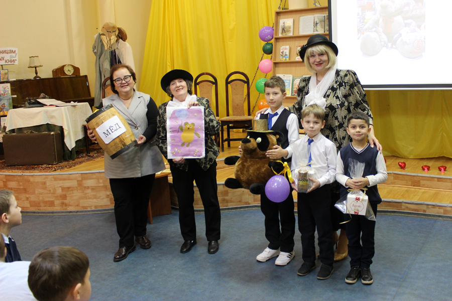 Первоклассники из лицея N 21 подарили Винни картонные фигурки медвежонка с похвалой герою любимой книги, а Артём Смиренников из гимназии N 32 преподнёс библиотечным актёрам картину «Винни». В завершение праздника ребята посмотрели выставку ярких изданий Марка Твена и Алана Милна, а также коллекцию старых открыток по книге «Винни-Пух».