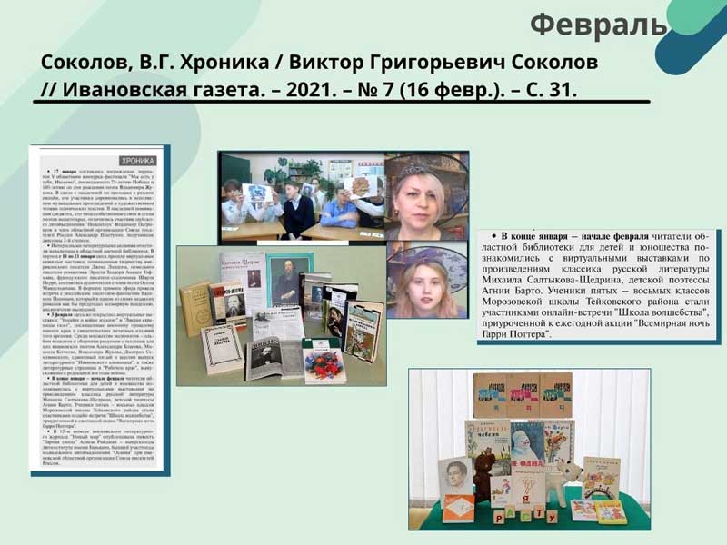 - Соколов, В.Г. Хроника / Виктор Григорьевич Соколов // Ивановская газета. – 2021. – N 7 (16 февр.). – С. 31. (Скачать)