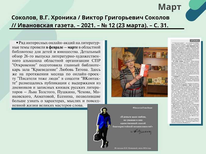 - Соколов, В.Г. Хроника / Виктор Григорьевич Соколов // Ивановская газета. – 2021. – N 12 (23 марта). – С. 31. (Скачать)