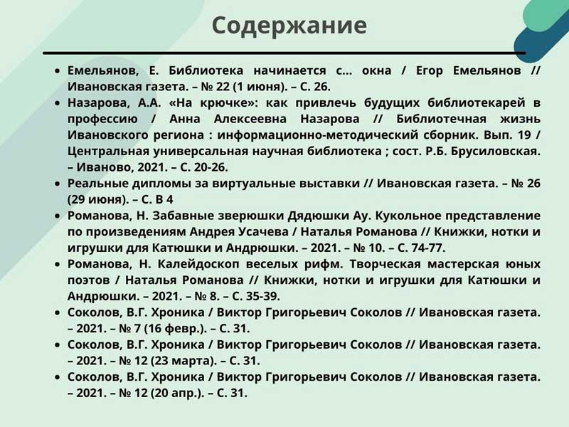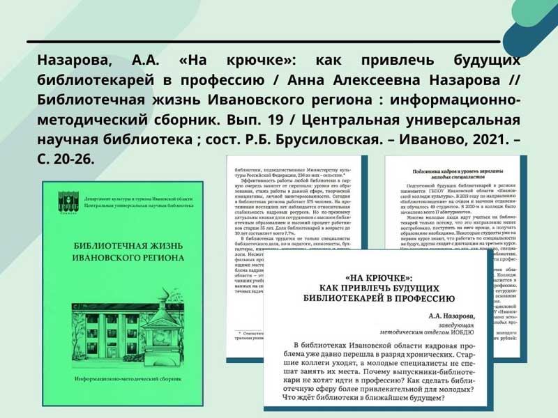 - Назарова, А.А. «На крючке»: как привлечь будущих библиотекарей в профессию / Анна Алексеевна Назарова // Библиотечная жизнь Ивановского региона : информационно-методический сборник. Вып. 19 / Центральная универсальная научная библиотека ; сост. Р.Б. Брусиловская. – Иваново, 2021. – С. 20-26. (Скачать)