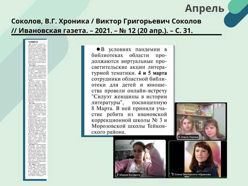 - Соколов, В.Г. Хроника / Виктор Григорьевич Соколов // Ивановская газета. – 2021. – N 12 (20 апр.). – С. 31. (Скачать)