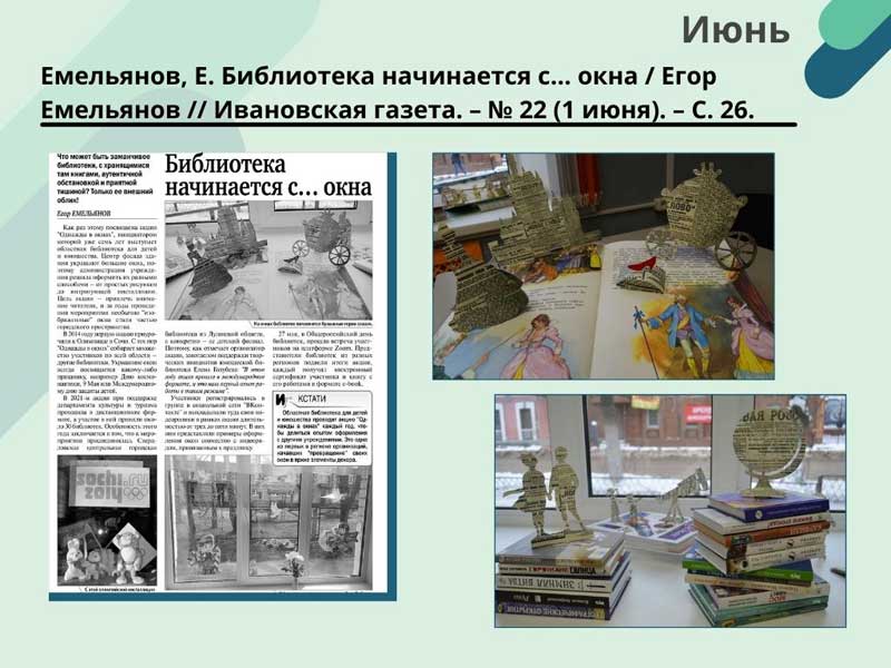 - Емельянов, Е. Библиотека начинается с… окна / Егор Емельянов // Ивановская газета. – N 22 (1 июня). – С. 26. (Скачать)