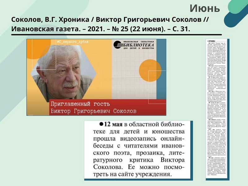 - Соколов, В.Г. Хроника / Виктор Григорьевич Соколов // Ивановская газета. – 2021. – N 25 (22 июня). – С. 31. (Скачать)