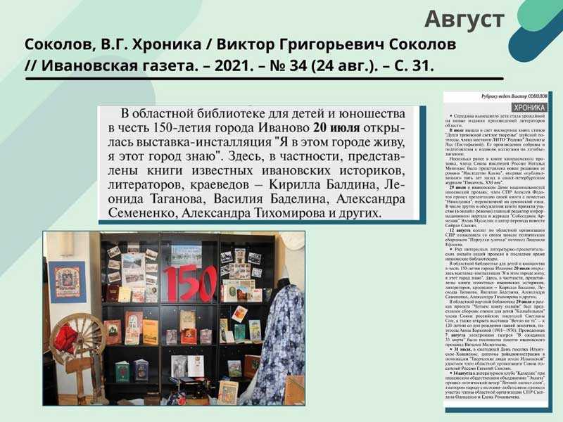 - Соколов, В.Г. Хроника / Виктор Григорьевич Соколов // Ивановская газета. – 2021. – N 34 (24 авг.). – С. 31. (Скачать)