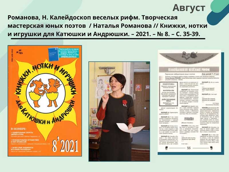 - Романова, Н. Калейдоскоп веселых рифм. Творческая мастерская юных поэтов / Наталья Романова // Книжки, нотки и игрушки для Катюшки и Андрюшки. – 2021. – N 8. – С. 35-39. (Скачать)