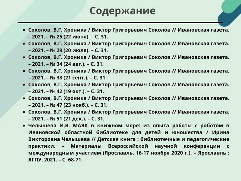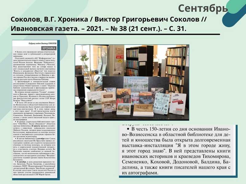 - Соколов, В.Г. Хроника / Виктор Григорьевич Соколов // Ивановская газета. – 2021. – N 42 (19 окт.). – С. 31. (Скачать)