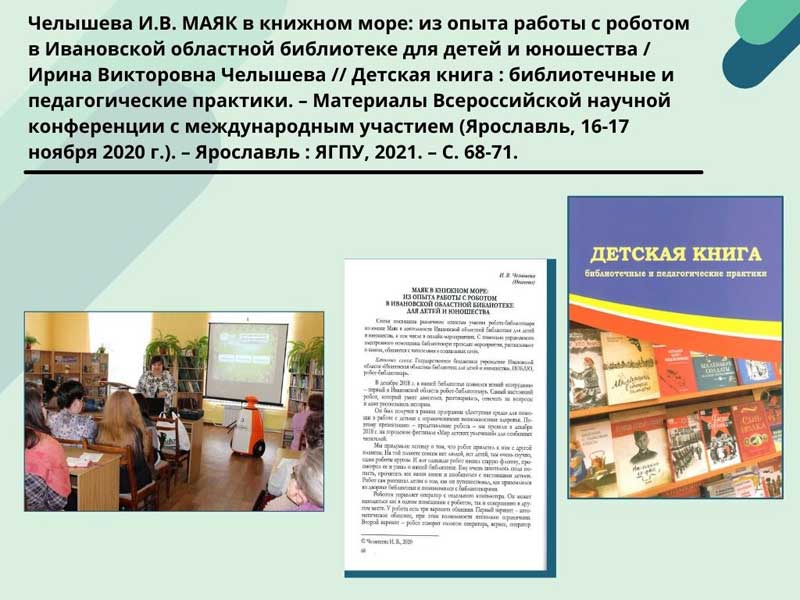 - Челышева И.В. МАЯК в книжном море: из опыта работы с роботом в Ивановской областной библиотеке для детей и юношества / Ирина Викторовна Челышева // Детская книга : библиотечные и педагогические практики. – Материалы Всероссийской научной конференции с международным участием (Ярославль, 16-17 ноября 2020 г.). – Ярославль : ЯГПУ, 2021. – С. 68-71. (Скачать)