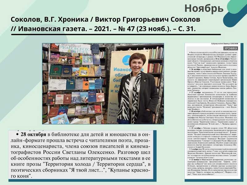 - Соколов, В.Г. Хроника / Виктор Григорьевич Соколов // Ивановская газета. – 2021. – N 47 (23 нояб.). – С. 31. (Скачать)