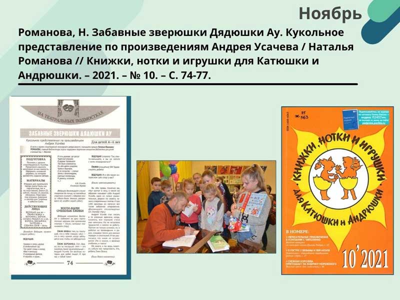 - Романова, Н. Забавные зверюшки Дядюшки Ау. Кукольное представление по произведениям Андрея Усачева / Наталья Романова // Книжки, нотки и игрушки для Катюшки и Андрюшки. – 2021. – N 10. – С. 74-77. (Скачать)