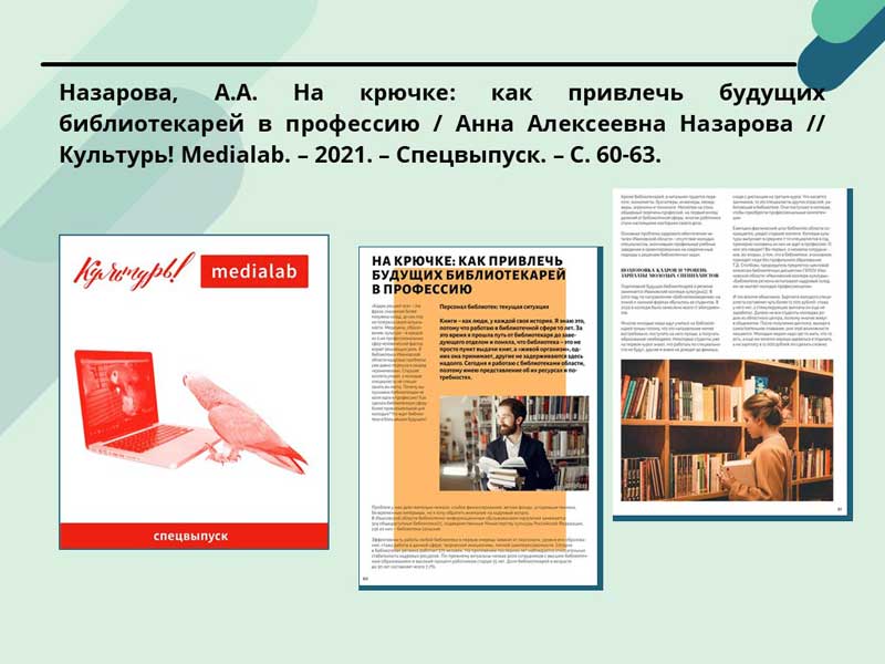 - Назарова А.А. На крючке: как привлечь будущих библиотекарей в профессию / Анна Алексеевна Назарова // Культурь! Medialab. – 2021. – Спецвыпуск. – С. 60-63. (Скачать)
