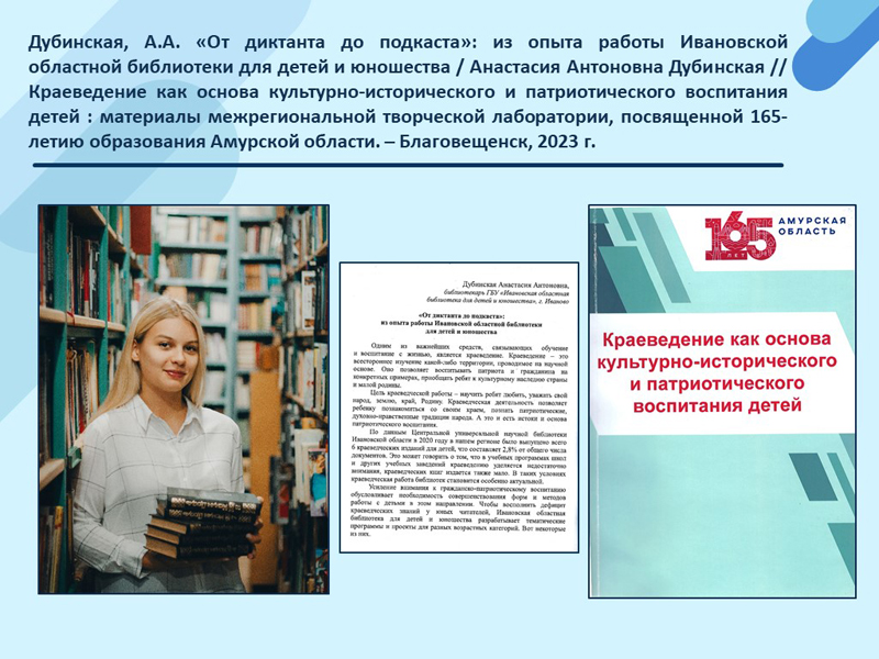 - Дубинская, А.А. «От диктанта до подкаста»: из опыта работы Ивановской областной библиотеки для детей и юношества / Анастасия Антоновна Дубинская // Краеведение как основа культурно-исторического и патриотического воспитания детей: материалы межрегиональной творческой лаборатории, посвященной 165-летию образования Амурской области. – Благовещенск, 2023 г. (Скачать)
