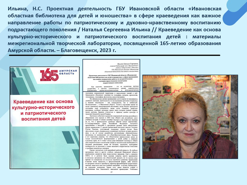 - Ильина, Н.С. Проектная деятельность ГБУ Ивановской области «Ивановская областная библиотека для детей и юношества» в сфере краеведения как важное направление работы по патриотическому и духовно-нравственному воспитанию подрастающего поколения / Наталья Сергеевна Ильина // Краеведение как основа культурно-исторического и патриотического воспитания детей: материалы межрегиональной творческой лаборатории, посвященной 165-летию образования Амурской области. – Благовещенск, 2023 г. (Скачать)