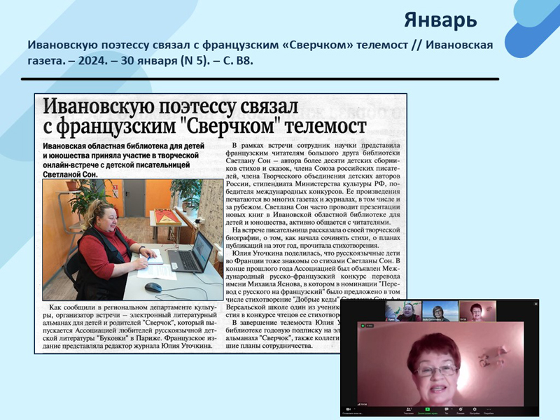 - Ивановскую поэтессу связал с французским «Сверчком» телемост // Ивановская газета. – 2024. – 30 января (N 5). – С. В8. (Скачать)