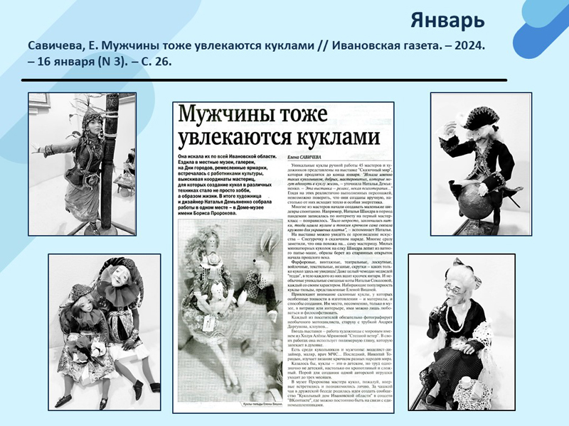 - Савичева, Е. Мужчины тоже увлекаются куклами // Ивановская газета. – 2024. – 16 января (N 3). – С. 26. (Скачать)