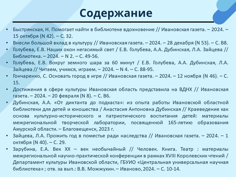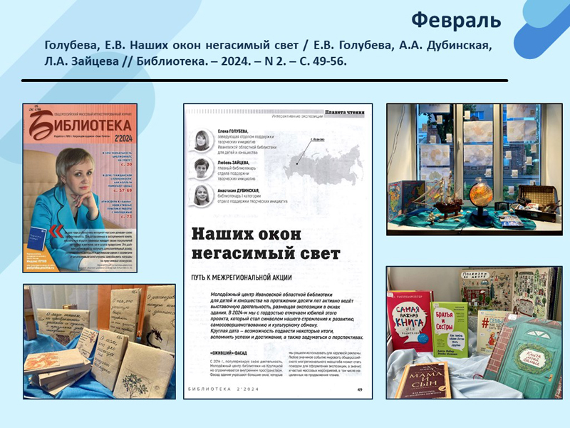- Голубева, Е.В. Наших окон негасимый свет / Е.В. Голубева, А.А. Дубинская, Л.А. Зайцева // Библиотека. – 2024. – N 2. – С. 49-56. (Скачать)