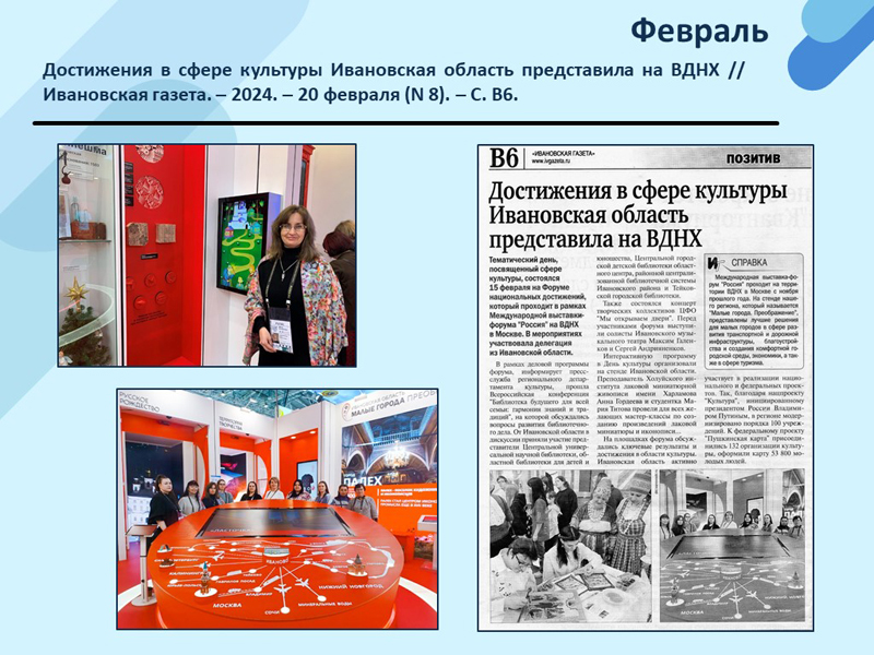 - Достижения в сфере культуры Ивановская область представила на ВДНХ // Ивановская газета. – 2024. – 20 февраля (N 8). – С. В6. (Скачать)