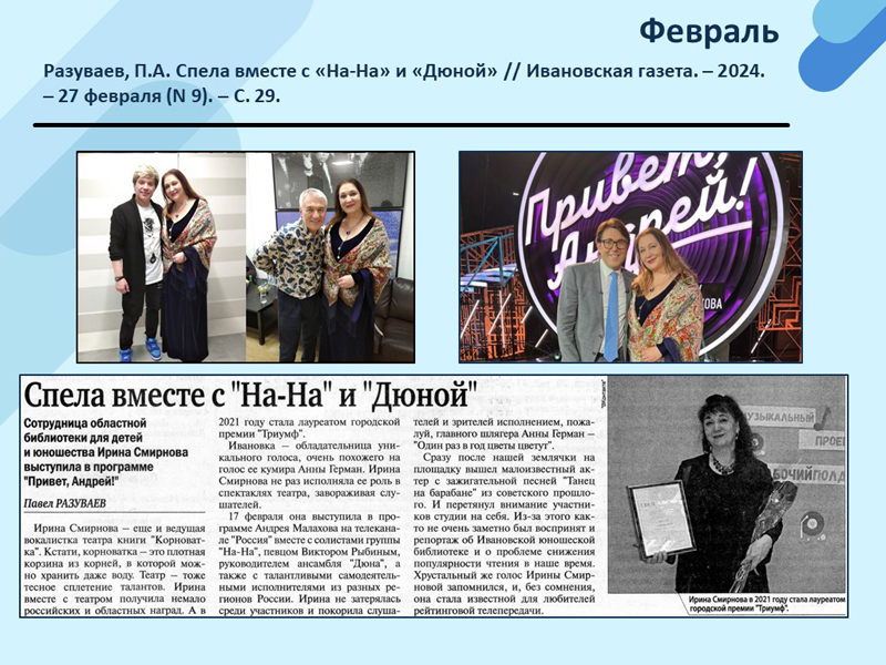 - Разуваев, П.А. Спела вместе с «На-На» и «Дюной» // Ивановская газета. – 2024. – 27 февраля (N 9). – С. 29. (Скачать)