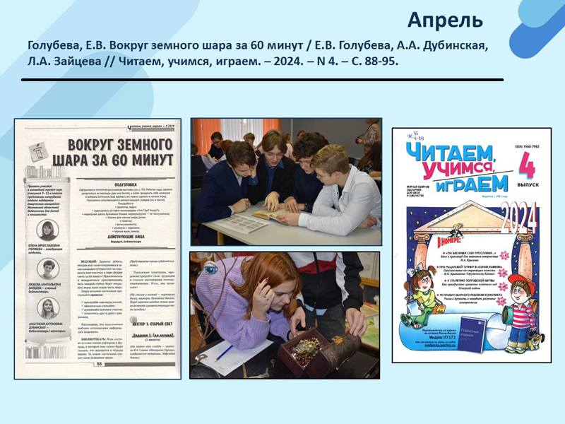 - Голубева, Е.В. Вокруг земного шара за 60 минут / Е.В. Голубева, А.А. Дубинская, Л.А. Зайцева // Читаем, учимся, играем. – 2024. – N 4. – С. 88-95. (Скачать)
