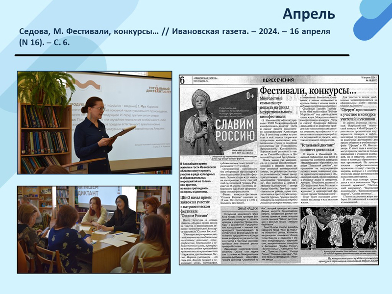 - Седова, М. Фестивали, конкурсы… // Ивановская газета. – 2024. – 16 апреля (N 16). – С. 6. (Скачать)