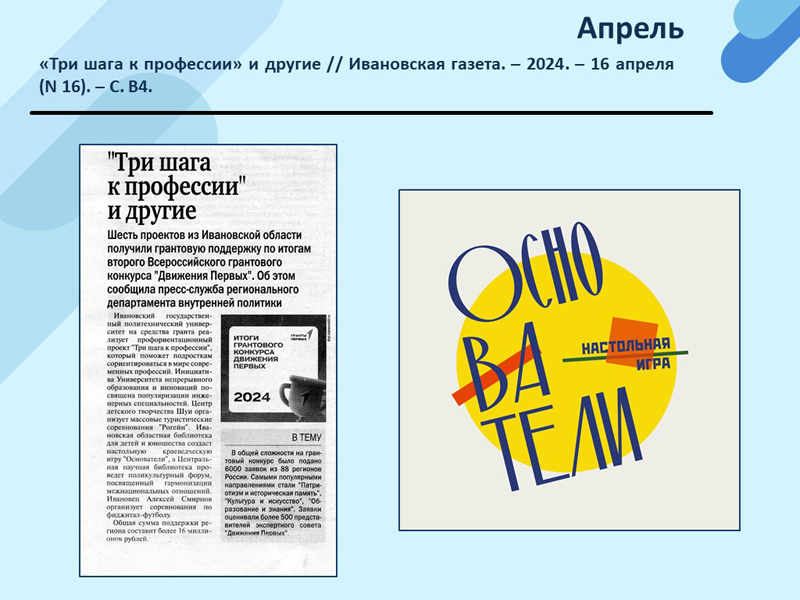 - «Три шага к профессии» и другие // Ивановская газета. – 2024. – 16 апреля (N 16). – С. В4. (Скачать)