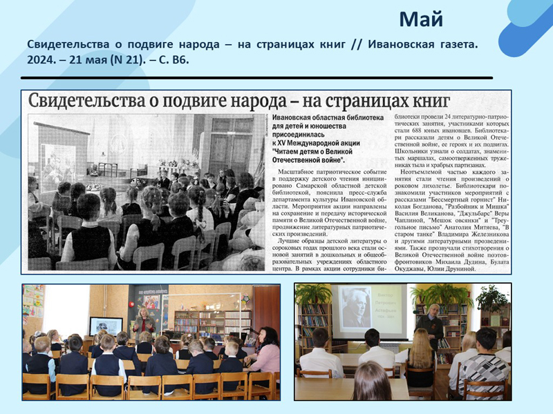 - Свидетельства о подвиге народа – на страницах книг // Ивановская газета. 2024. – 21 мая (N 21). – С. В6. (Скачать)