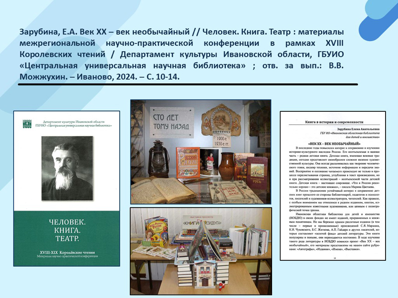 - Зарубина, Е.А. Век ХХ – век необычайный // Человек. Книга. Театр : материалы межрегиональной научно-практической конференции в рамках XVIII Королевских чтений / Департамент культуры Ивановской области, ГБУИО «Центральная универсальная научная библиотека» ; отв. за вып.: В.В. Можжухин. – Иваново, 2024. – С. 10-14. (Скачать)