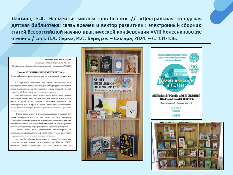 - Лактина, Е.А. Элементы: читаем non-fiction» // «Центральная городская детская библиотека: связь времен и вектор развития» : электронный сборник статей Всероссийской научно-практической конференции «VIII Колесниковские чтения» / сост. Л.А. Серых, И.О. Беридзе. – Самара, 2024. – С. 131-136. (Скачать)