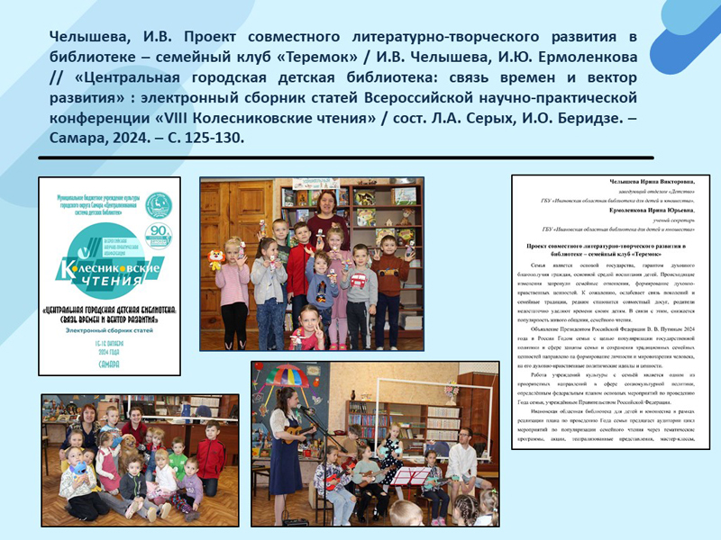 - Челышева, И.В. Проект совместного литературно-творческого развития в библиотеке – семейный клуб «Теремок» / И.В. Челышева, И.Ю. Ермоленкова // «Центральная городская детская библиотека: связь времен и вектор развития» : электронный сборник статей Всероссийской научно-практической конференции «VIII Колесниковские чтения» / сост. Л.А. Серых, И.О. Беридзе. – Самара, 2024. – С. 125-130. (Скачать)