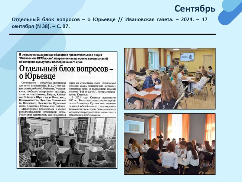 - Отдельный блок вопросов – о Юрьевце // Ивановская газета. – 2024. – 17 сентября (N 38). – С. В7. (Скачать)
