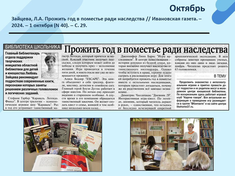 - Зайцева, Л.А. Прожить год в поместье ради наследства // Ивановская газета. – 2024. – 1 октября (N 40). – С. 29. (Скачать)