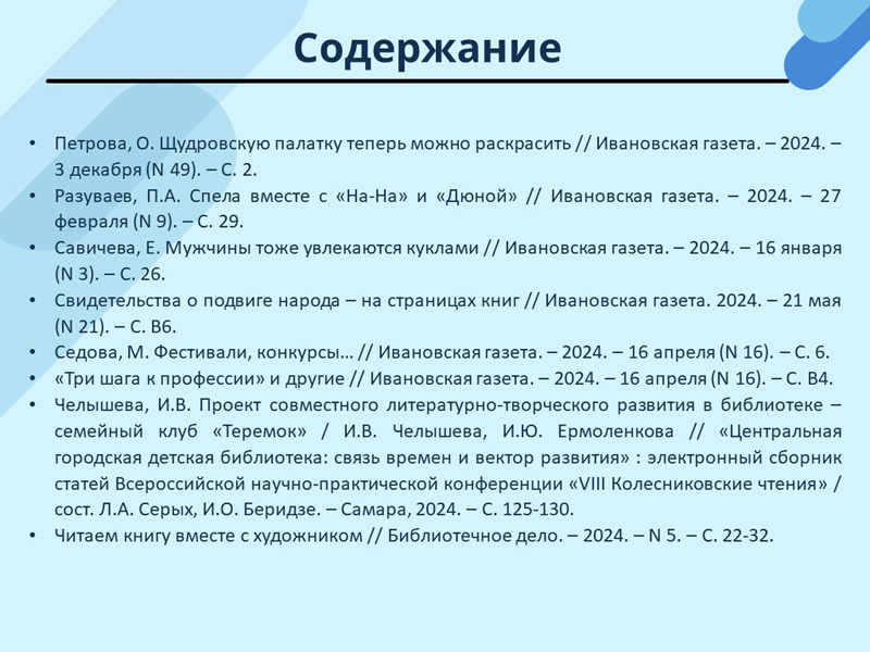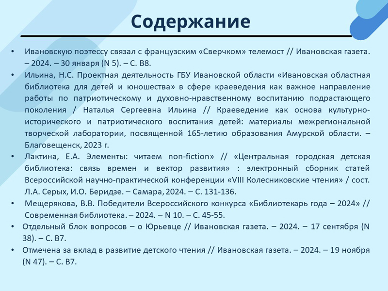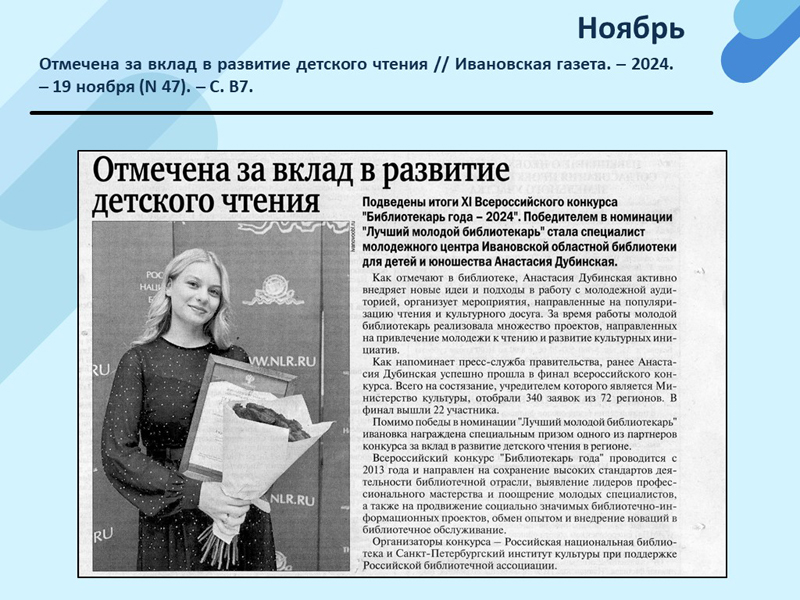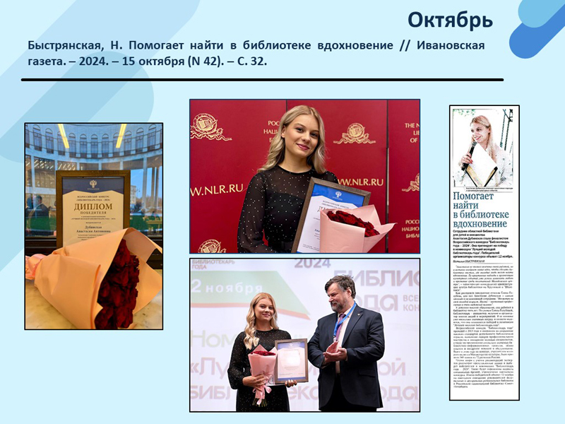 - Быстрянская, Н. Помогает найти в библиотеке вдохновение // Ивановская газета. – 2024. – 15 октября (N 42). – С. 32. (Скачать)