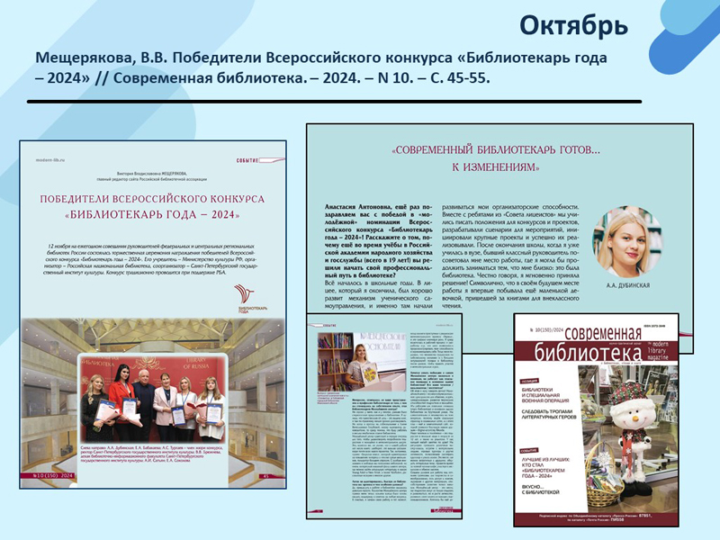- Мещерякова, В.В. Победители Всероссийского конкурса «Библиотекарь года – 2024» // Современная библиотека. – 2024. – N 10. – С. 45-55. (Скачать)