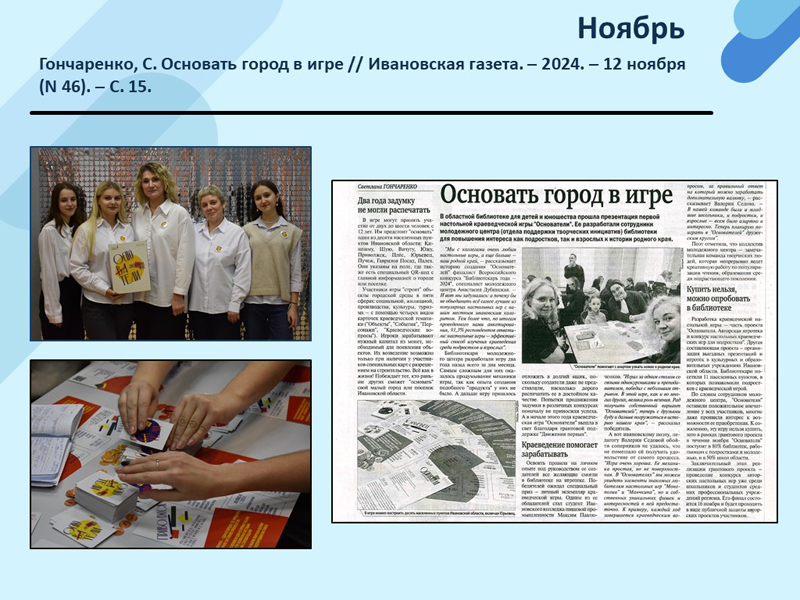 - Гончаренко, С. Основать город в игре // Ивановская газета. – 2024. – 12 ноября (N 46). – С. 15. (Скачать)