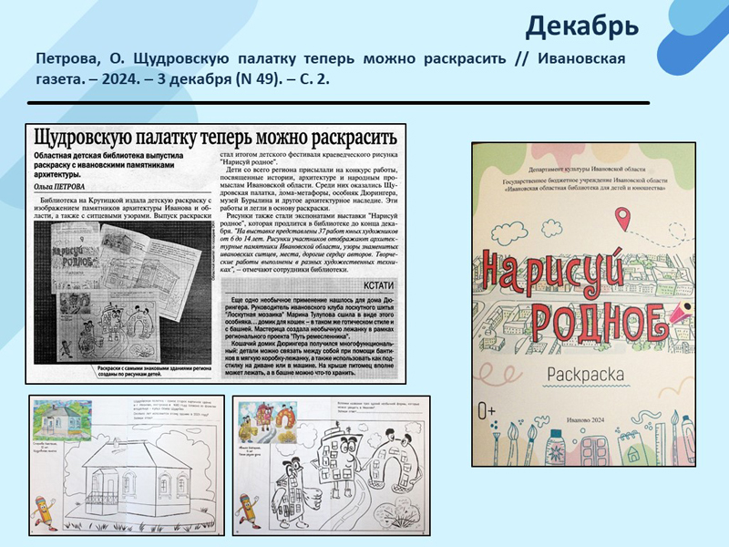 - Петрова, О. Щудровскую палатку теперь можно раскрасить // Ивановская газета. – 2024. – 3 декабря (N 49). – С. 2. (Скачать)