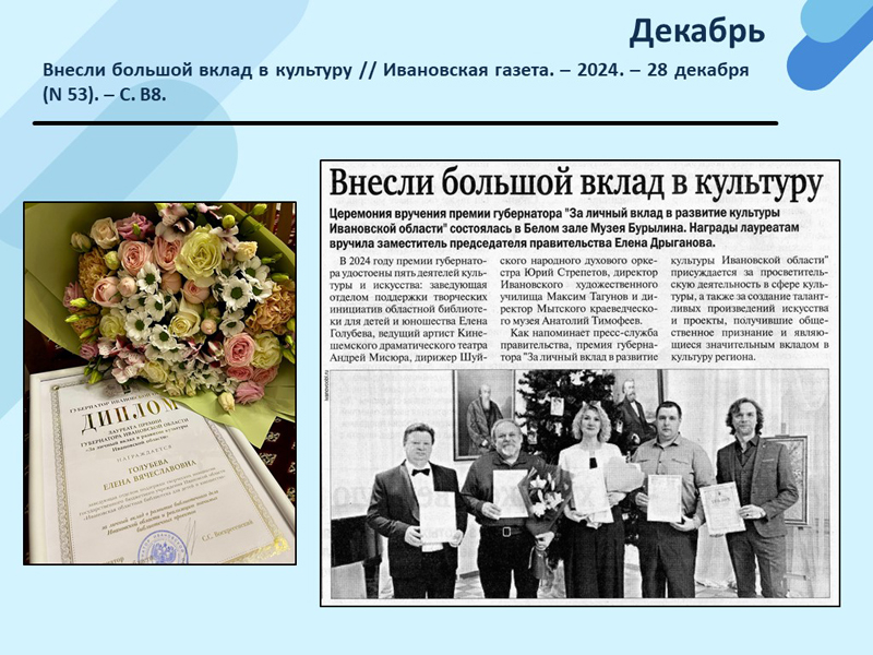 - Внесли большой вклад в культуру // Ивановская газета. – 2024. – 28 декабря (N 53). – С. В8. (Скачать)