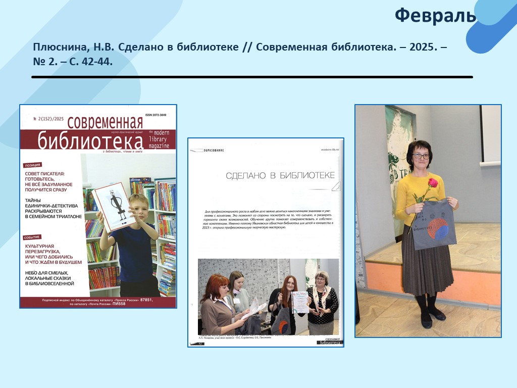 - Плюснина, Н.В. Сделано в библиотеке // Современная библиотека. – 2025. – N 2. – С. 42-44. (Скачать)