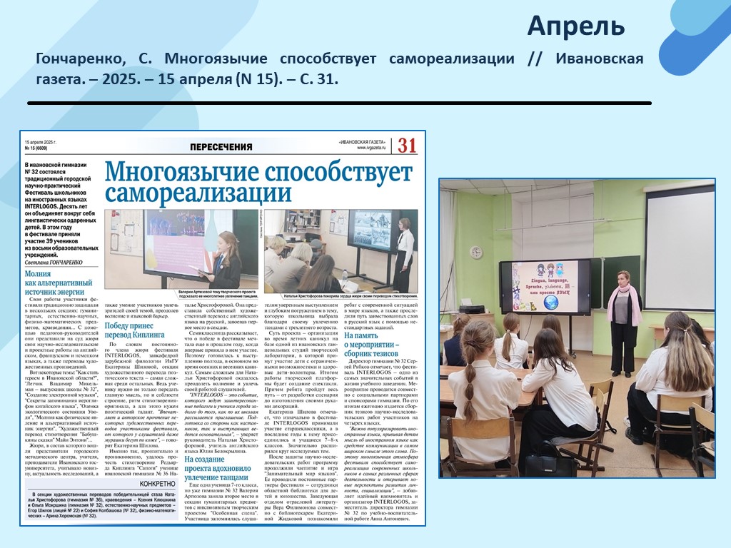 - Гончаренко, С. Многоязычие способствует самореализации // Ивановская газета. – 2025. – 15 апреля (N 15). – С. 31. (Скачать)