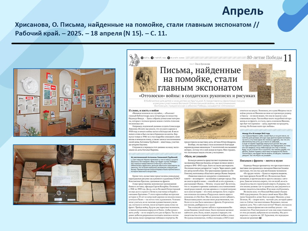 - Хрисанова, О. Письма, найденные на помойке, стали главным экспонатом // Рабочий край. – 2025. – 18 апреля (N 15). – С. 11. (Скачать)