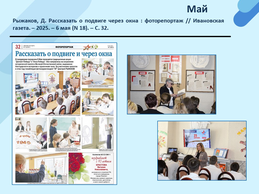 - Рыжаков, Д. Рассказать о подвиге через окна : фоторепортаж // Ивановская газета. – 2025. – 6 мая (N 18). – С. 32. (Скачать)
