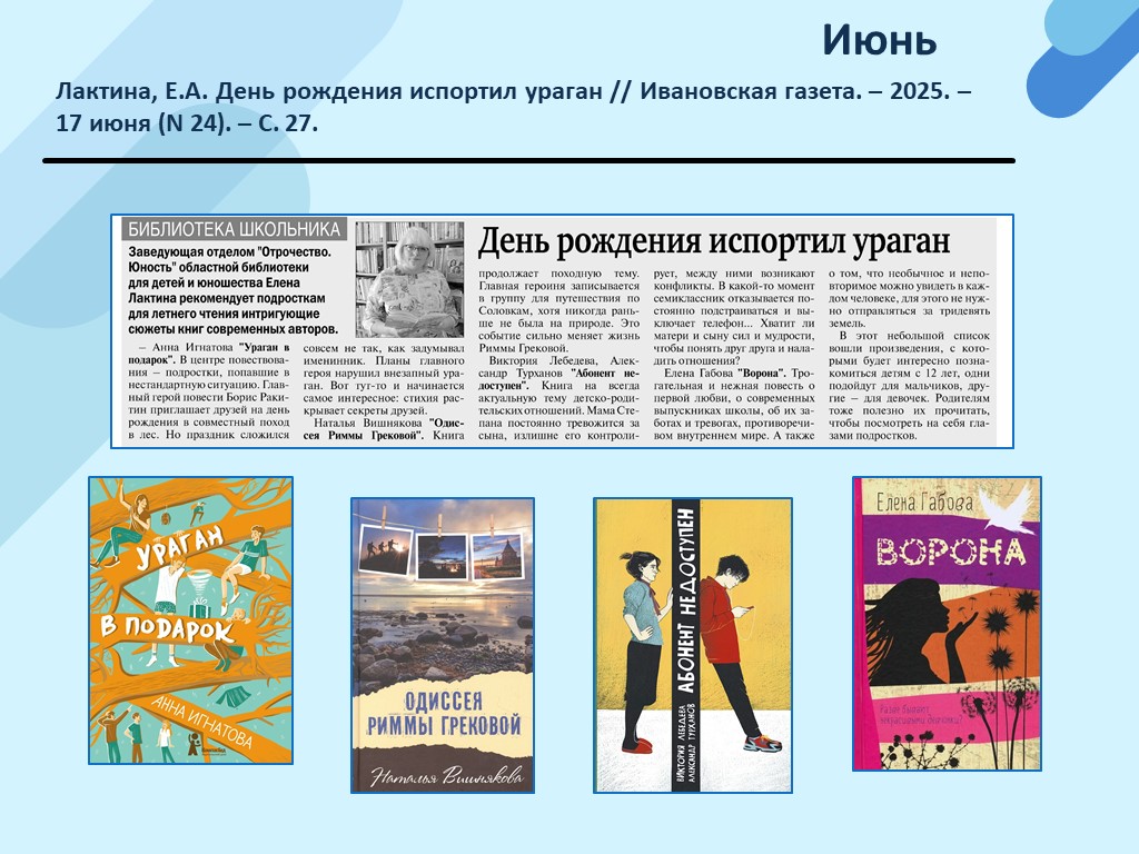 - Лактина, Е.А. День рождения испортил ураган // Ивановская газета. – 2025. – 17 июня (N 24). – С. 27. (Скачать)