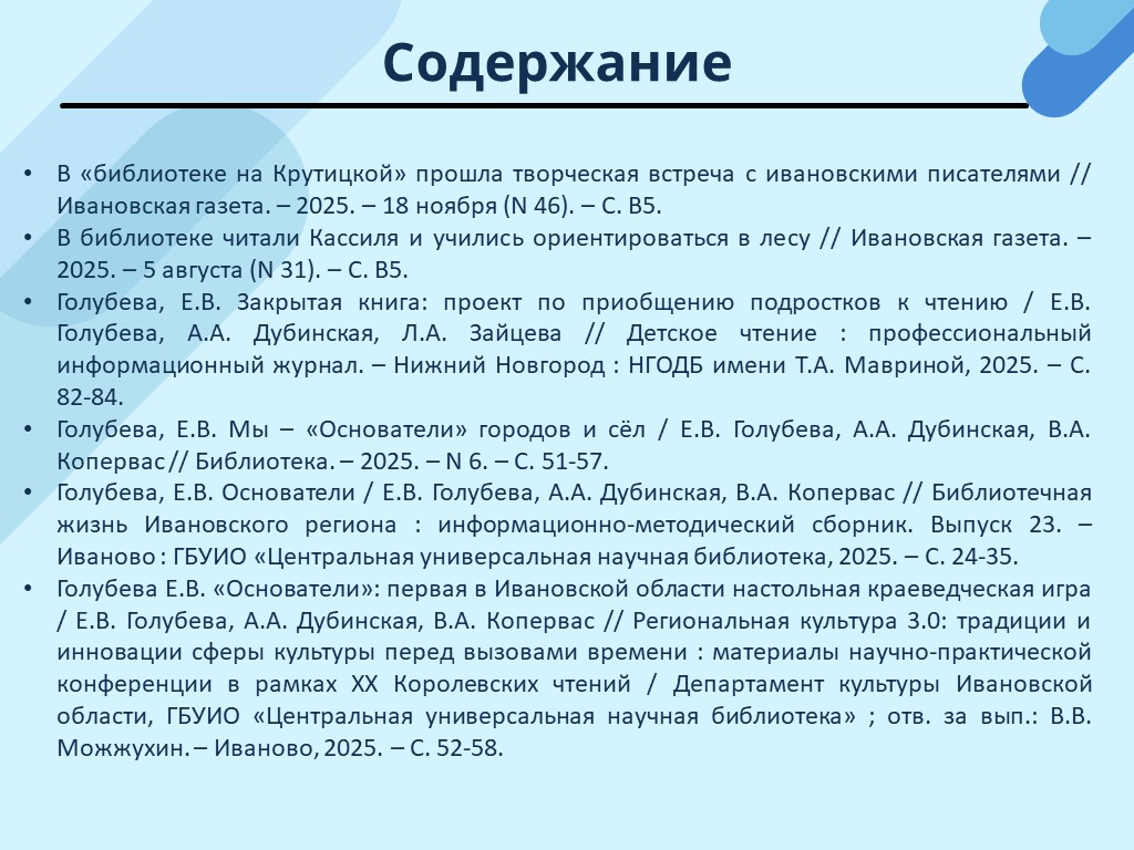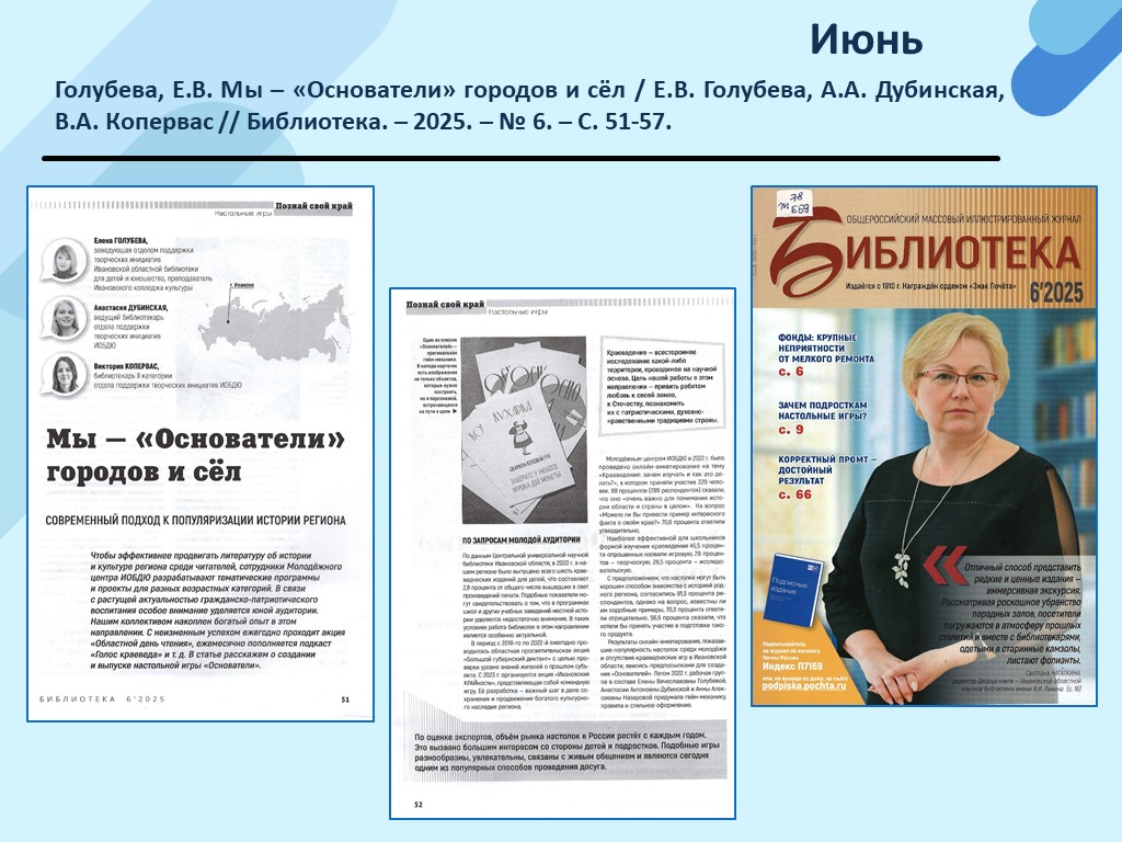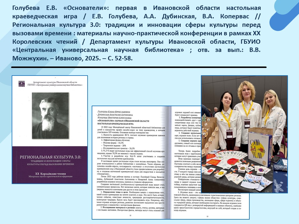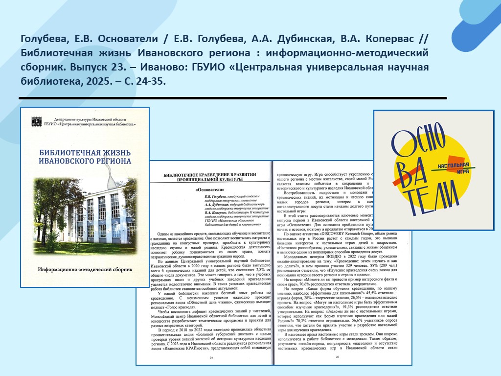 - Голубева Е.В. «Основатели»: первая в Ивановской области настольная краеведческая игра / Е.В. Голубева, А.А. Дубинская, В.А. Копервас // Региональная культура 3.0: традиции и инновации сферы культуры перед вызовами времени : материалы научно-практической конференции в рамках ХХ Королевских чтений / Департамент культуры Ивановской области, ГБУИО «Центральная универсальная научная библиотека» ; отв. за вып.: В.В. Можжухин. – Иваново, 2025. – С. 52-58. (Скачать)