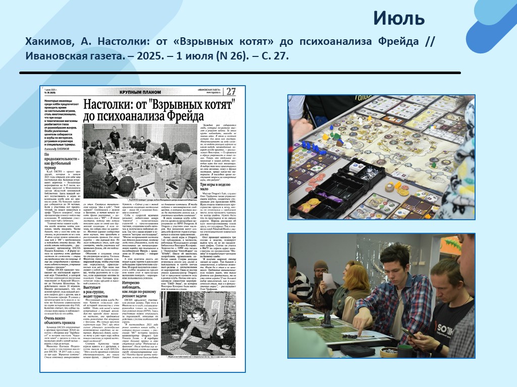 - Хакимов, А. Настолки: от «Взрывных котят» до психоанализа Фрейда // Ивановская газета. – 2025. – 1 июля (N 26). – С. 27. (Скачать)