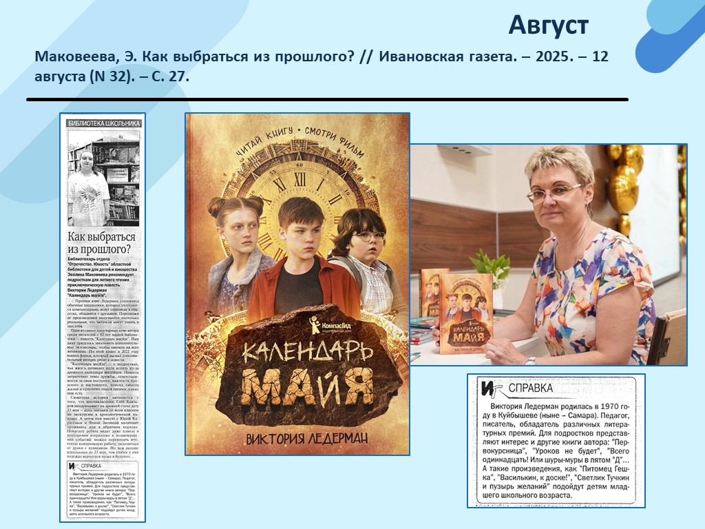 - Маковеева, Э. Как выбраться из прошлого? // Ивановская газета. – 2025. – 12 августа (N 32). – С. 27. (Скачать)