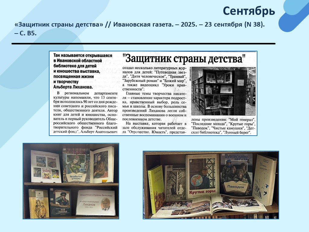 - «Защитник страны детства» // Ивановская газета. – 2025. – 23 сентября (N 38). – С. В5. (Скачать)