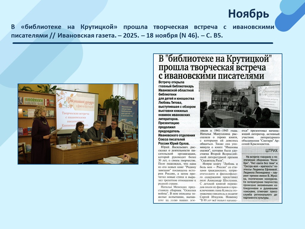 - В «библиотеке на Крутицкой» прошла творческая встреча с ивановскими писателями // Ивановская газета. – 2025. – 18 ноября (N 46). – С. В5. (Скачать)