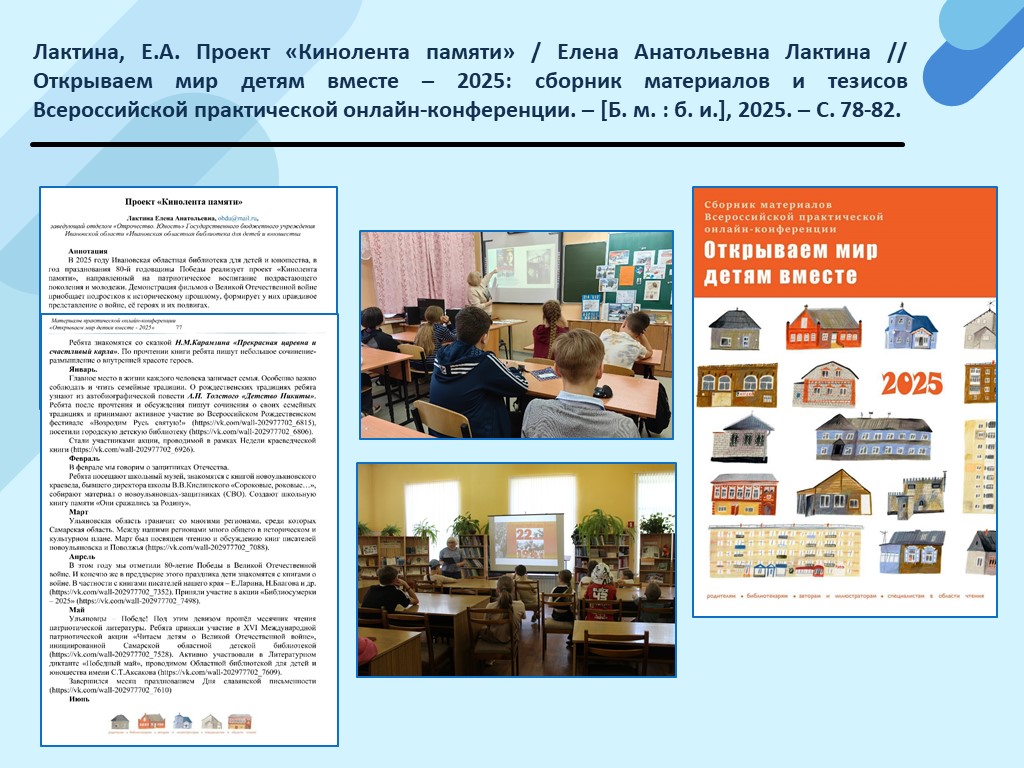 - Лактина, Е.А. Проект «Кинолента памяти» / Елена Анатольевна Лактина // Открываем мир детям вместе – 2025: сборник материалов и тезисов Всероссийской практической онлайн-конференции. – [Б. м. : б. и.], 2025. – С. 78-82. (Скачать)