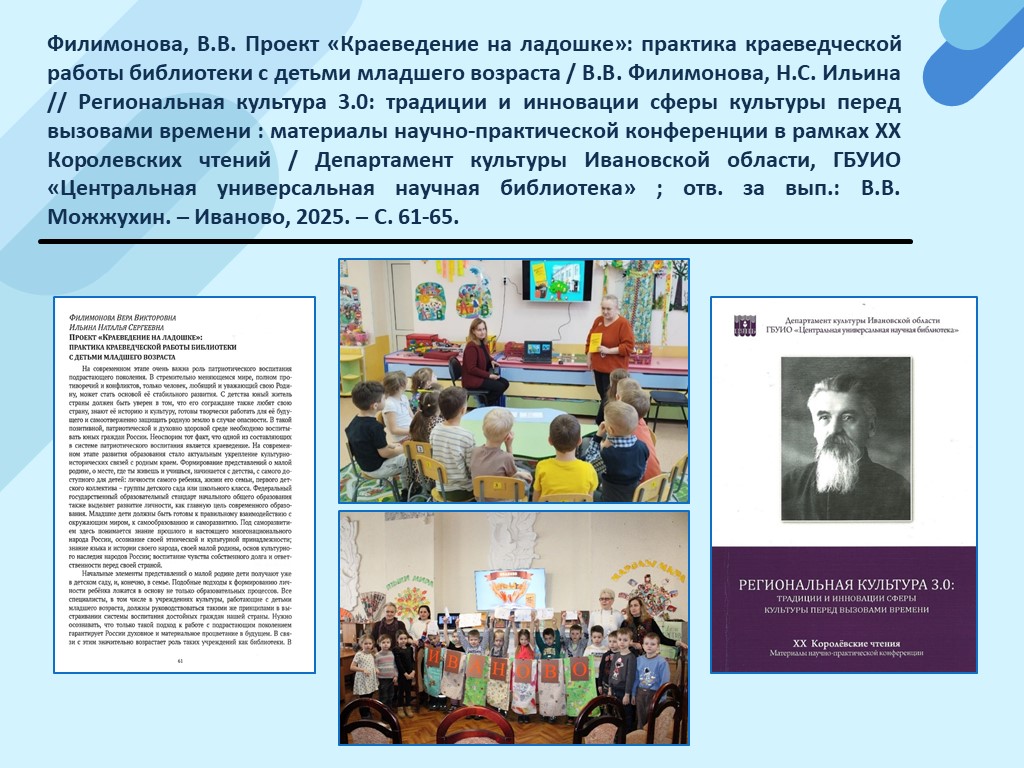 - Филимонова В.В. Проект «Краеведение на ладошке»: практика краеведческой работы библиотеки с детьми младшего возраста / В.В. Филимонова, Н.С. Ильина // Региональная культура 3.0: традиции и инновации сферы культуры перед вызовами времени : материалы научно-практической конференции в рамках ХХ Королевских чтений / Департамент культуры Ивановской области, ГБУИО «Центральная универсальная научная библиотека» ; отв. за вып.: В.В. Можжухин. – Иваново, 2025. – С. 61-65. (Скачать)