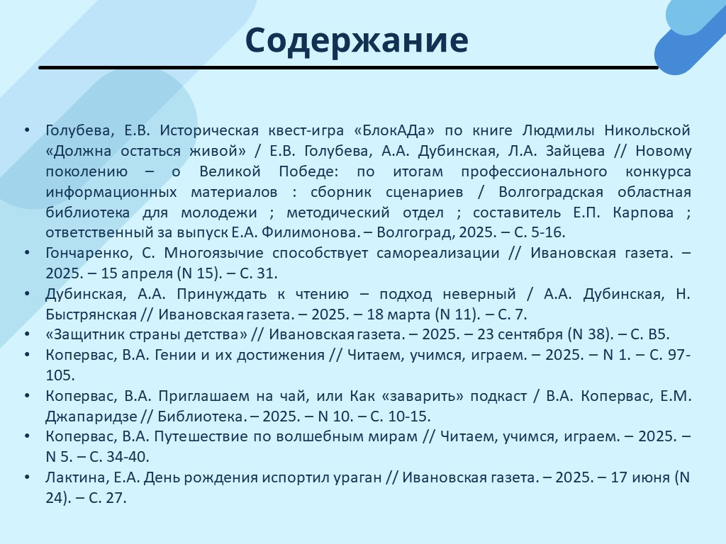 - Голубева, Е.В. Историческая квест-игра «БлокАДа» по книге Людмилы Никольской «Должна остаться живой» / Е.В. Голубева, А.А. Дубинская, Л.А. Зайцева // Новому поколению – о Великой Победе: по итогам профессионального конкурса информационных материалов : сборник сценариев / Волгоградская областная библиотека для молодежи ; методический отдел ; составитель Е. П. Карпова ; ответственный за выпуск Е. А. Филимонова. – Волгоград, 2025. – С. 5-16. (Скачать)