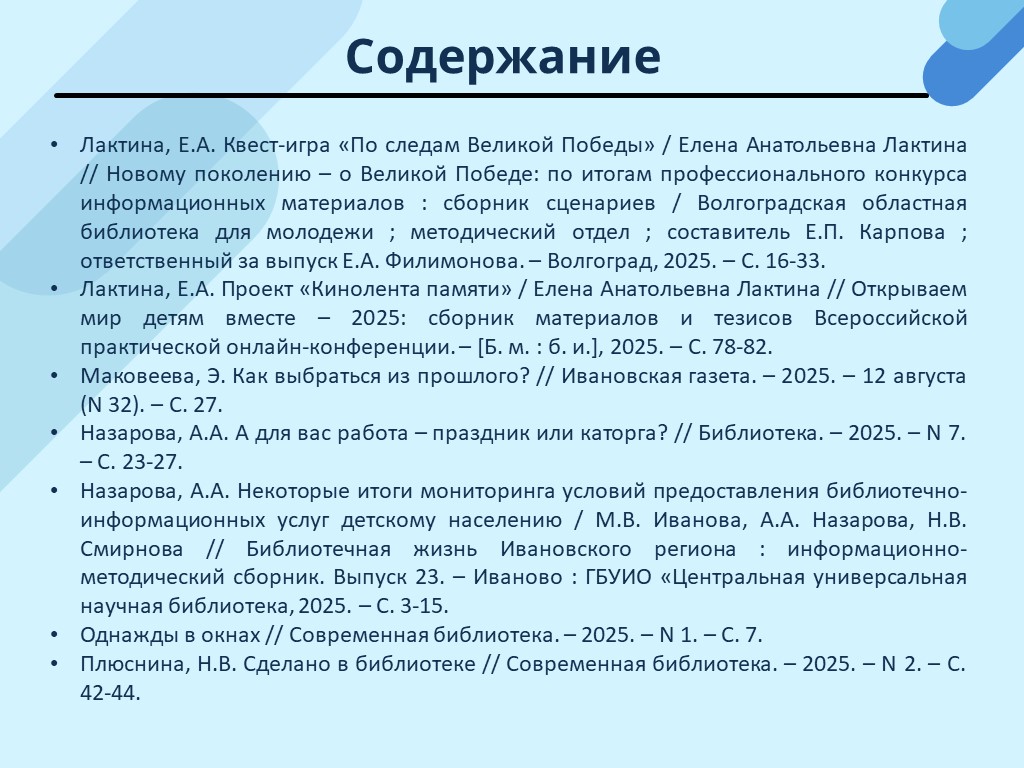 - Назарова, А.А. Некоторые итоги мониторинга условий предоставления библиотечно-информационных услуг детскому населению / М.В. Иванова, А.А. Назарова, Н.В. Смирнова // Библиотечная жизнь Ивановского региона : информационно-методический сборник. Выпуск 23. – Иваново: ГБУИО «Центральная универсальная научная библиотека, 2025. – С. 3-15. (Скачать)