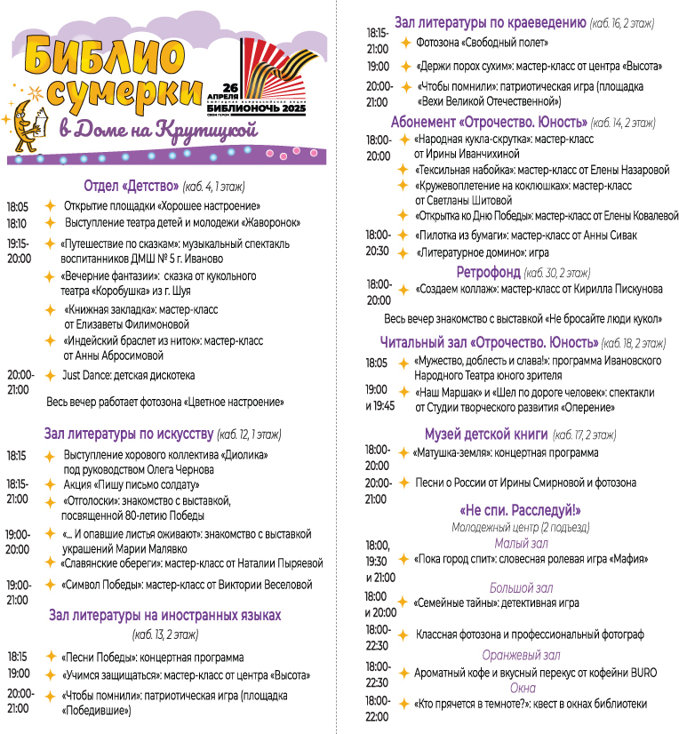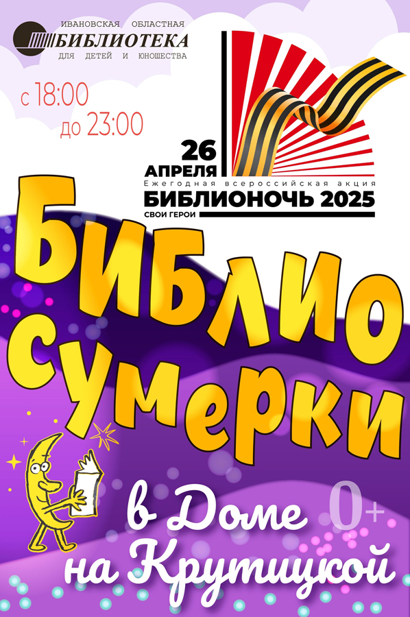 26 апреля 2025 года с 18.00 до 23.00 в Ивановской областной библиотеке для детей и юношества состоится акция «Библиосумерки-2025 в Доме на Крутицкой» в рамках ежегодного Всероссийского фестиваля чтения «Библионочь». Социокультурная инициатива приурочена к Году защитника Отечества и 80-летию Великой Победы.